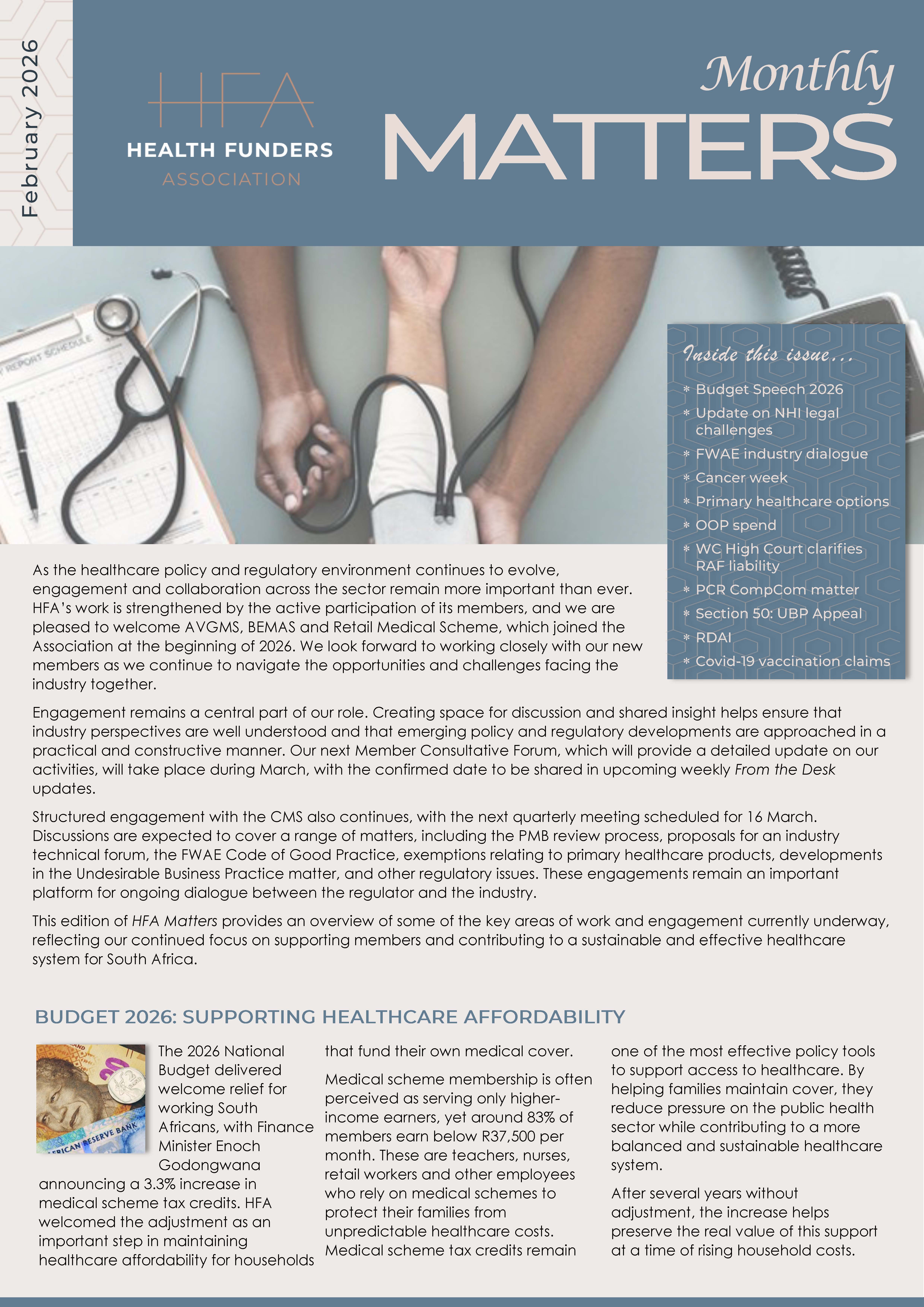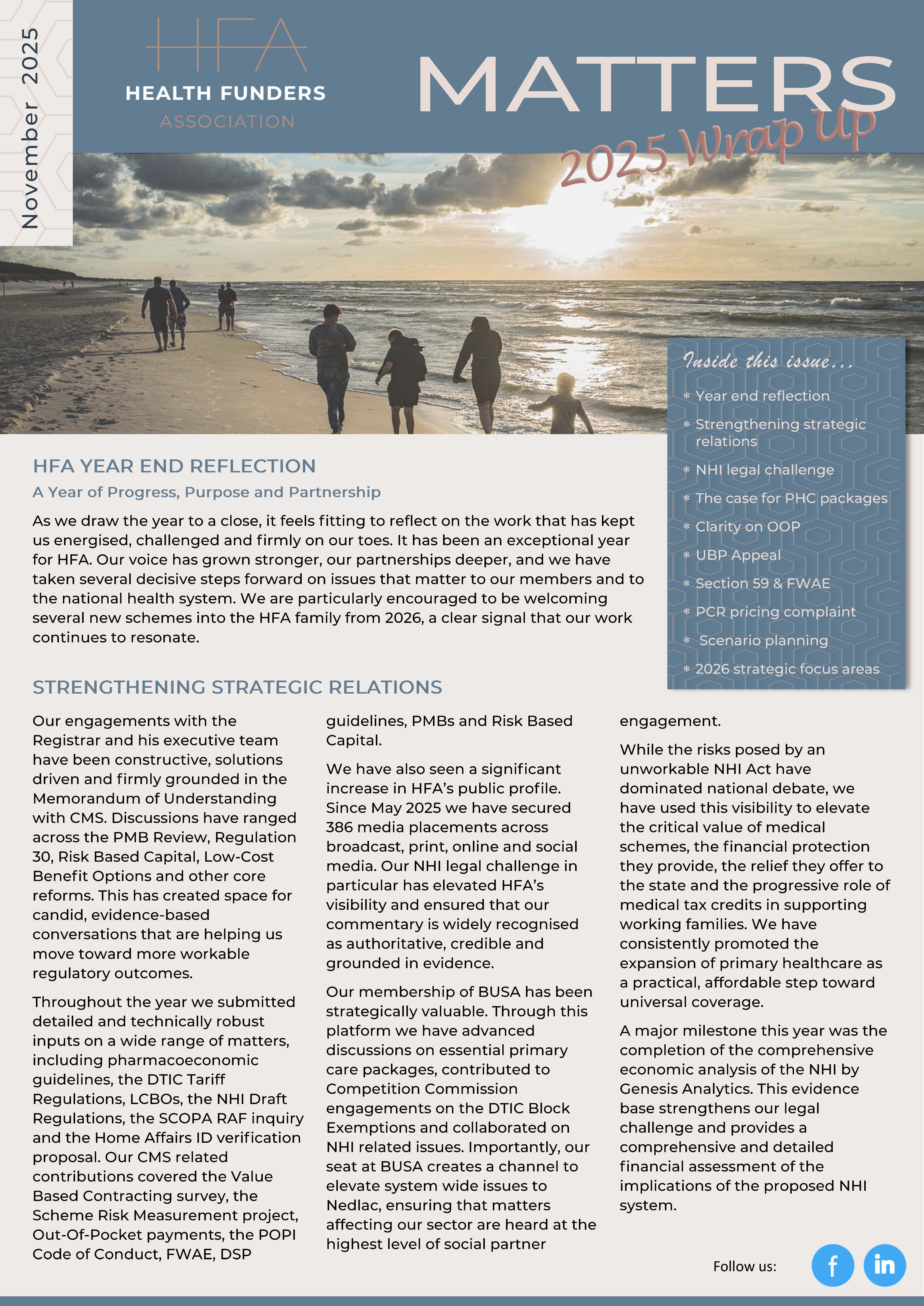 Representing 20 medical schemes and 3 administrators, covering 45% of the private healthcare market (4.1 million beneficiaries), HFA plays a pivotal role in engaging policymakers and shaping public opinion on healthcare funding issues.